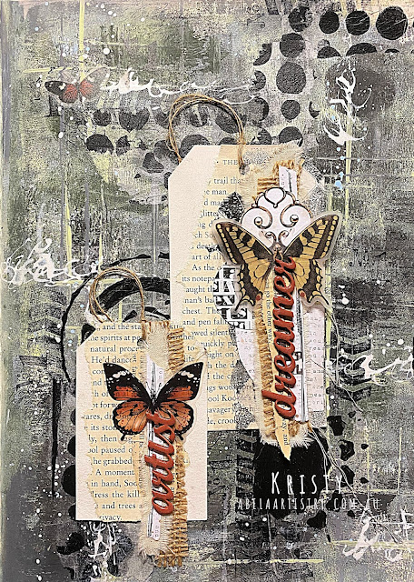 In the background I started with layers my favourite chalk based paints with a brayer. I then used an old store card to create some vertical and horizontal lines. Along those lines I used a fine tip applicator with white acrylic to add some random scribble text.